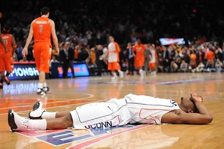 In 3 hours and 46 minutes, you could binge watch just about 4 episodes of your favorite show on any given streaming service. You could jam out to 53 different songs (factoring in the average song length in 2009) on your playlist. You could watch 99.99999% of movies that have ever been made. Notable exceptions would be Gone with the Wind (1939), Lawrence of Arabia (1962), Cleopatra (1963) and Once Upon a Time In America (1984). Hell, in the time of the aforementioned contest, you could drive most of the distance between the University of Connecticut’s campus in Storrs and Syracuse University’s campus in upstate New York. The point is that in 3 hours and 46 minutes, one can consume almost any form of media, complete most tasks and find many other means of enjoyment a few times over. However, on that fateful March night, scores of die-hard Syracuse and Uconn fans (both at home and at Madison Square Garden), as well as announcers and media personnel, spent all of this time watching, calling, and taking in one, single, college basketball game.