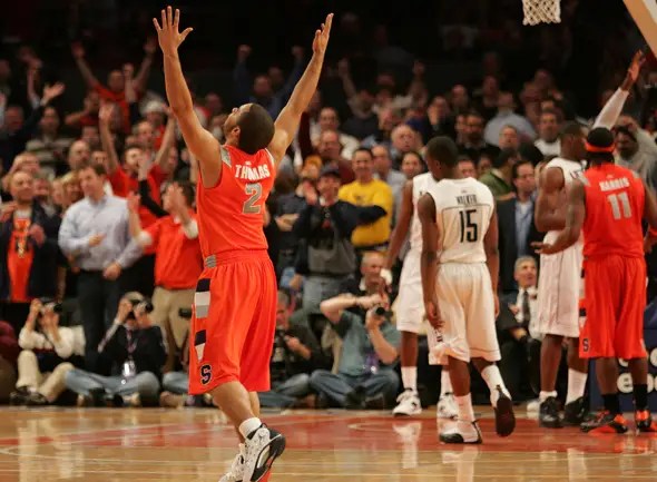 That’s the time this drawn out game did what had seemed impossible: end. In this version of overtime, Syracuse finally led. As a matter of fact, they scored the first eight points of the period and never looked back, finally winning this game of gargantuan length by the score of 127-117. In the end, 244 total points were scored (102 of those were scored in overtime), easily the most in Big East Tournament history. There were 66 combined fouls, 93 free throw attempts, and 43 overall turnovers. Cuse’s Johnny Flynn was the game’s top scorer with 34 points and also the top assist man with 11. He also led each side in minutes played, being on the court for 67 of the 70 available. A.J. Price led the way for the Huskies with 33 points and 10 helpers. Devendorf, who was the tournament’s leading scorer, had 22 points before fouling out. It was Jim Boeheim’s 796th win in his fabled career. The matchup began on Thursday, March 12th and concluded on Friday, March 13th. Despite the calendar, Boeheim and Syracuse must have considered themselves very lucky indeed.