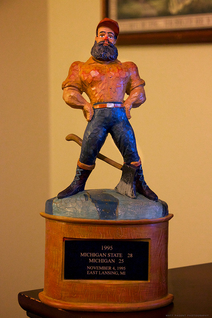 Every die hard college football fan knows that there truly is no offseason when it comes to the sport we love. Now is about the time followers start getting invested in Spring practices, games, and press conferences. Anything just to catch a glimpse of what their favorite school’s team might look like by the time the regular season begins in late August. Is that new transfer quarterback really the guy to lead your side to the playoff? How will the defensive line improve with three starters returning? What if your team has a new head coach? Will he be the man to bring your program to the next level? All these questions and more are raised, debated, and discussed during this time of the year. However, these discussions simply amount to us dreaming about September, October, and November during the month of April. The fact is, by this time of the year, we miss college football and the rivalries that make it such a special part of our country. One of those rivalries is the yearly in-state classic between the University of Michigan and Michigan State. However, the game isn’t just about local bragging rights. These two schools also battle for a famous trophy of perhaps the most well known mythical man around: Paul Bunyan. Let’s explain further………..